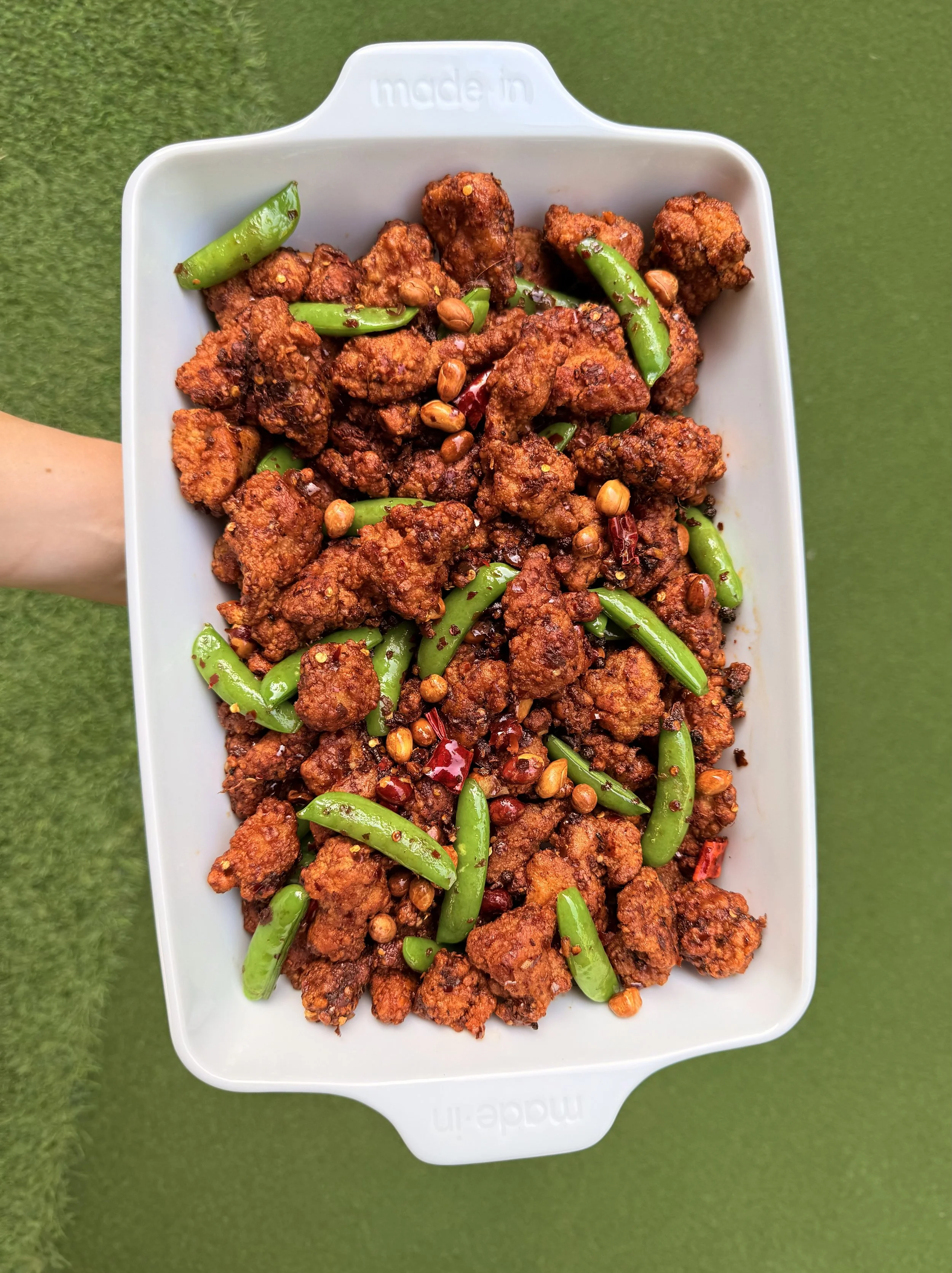 Mala Fried Chicken with Fried Peanuts, Sugar Snap Peas and Szechuan Chili